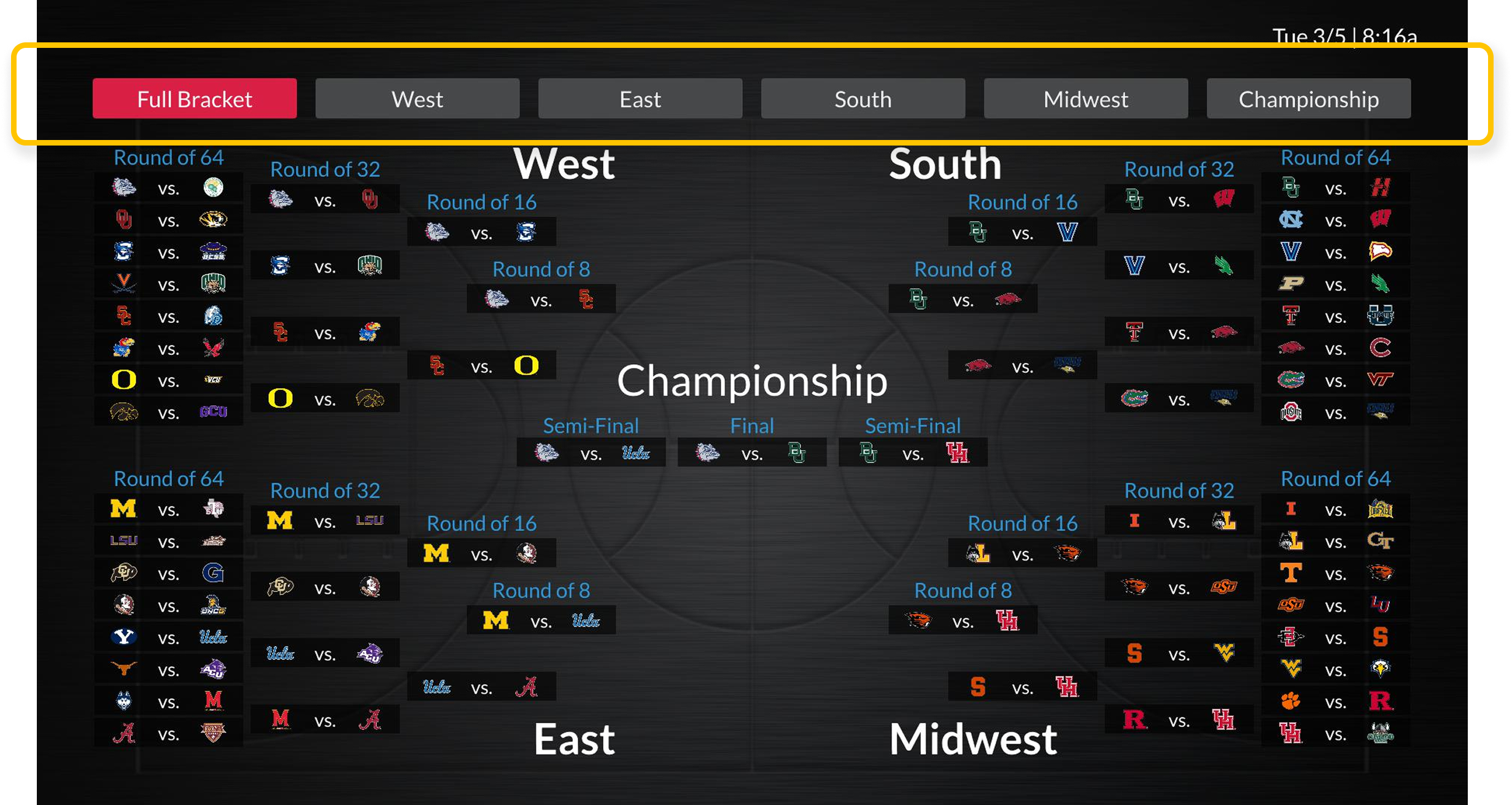 When testing the “Bracket View” prototype, I discovered confusion moving between regions with the remote’s directional pad. I got buy-in from my tech lead on a persistent tab-based navigation pattern that acted as clear signposts and reduced the number of key pressed needed to navigate between regions.