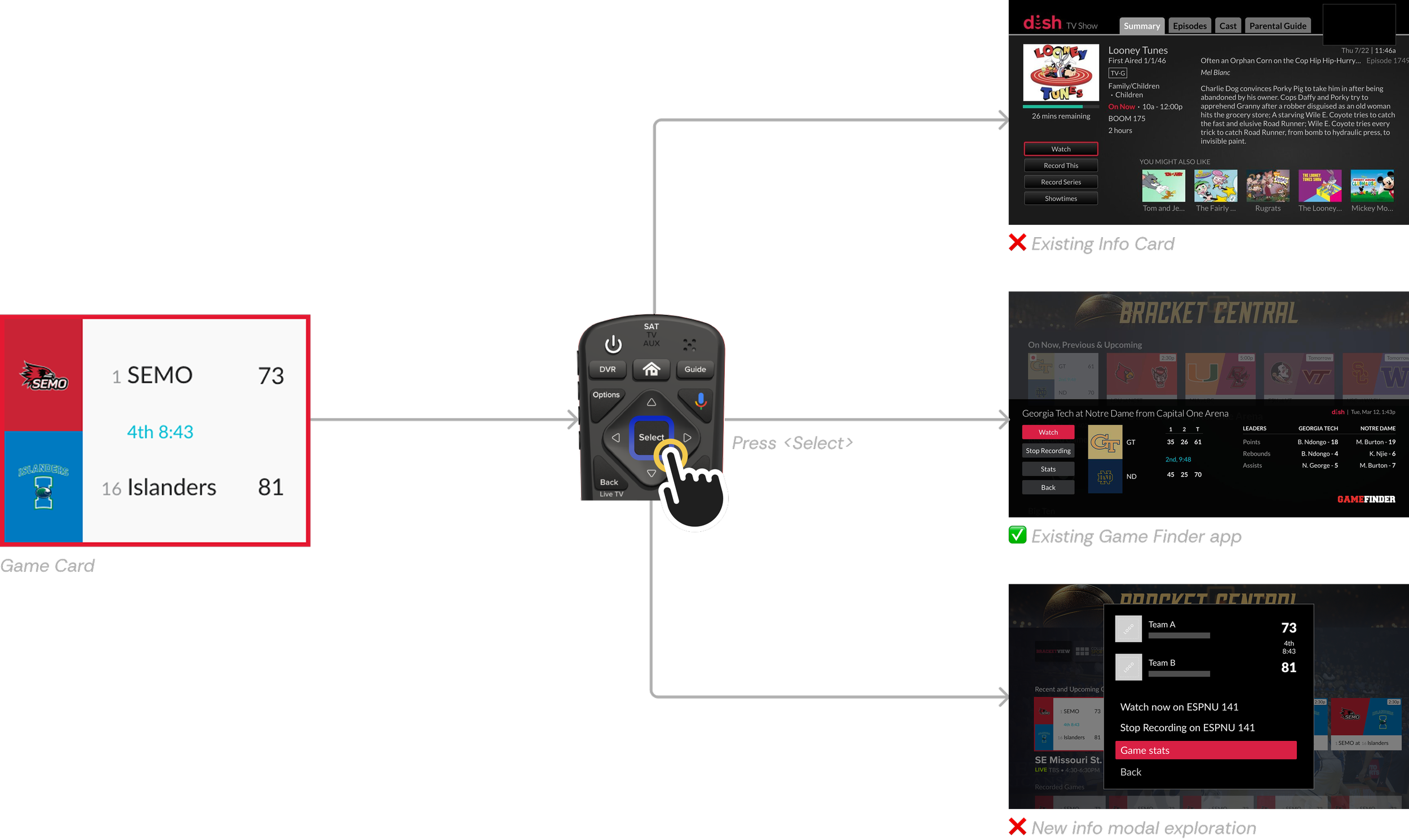 I designed an TV app for DISH receivers where viewers can discover live, scheduled and recorded games, view game statistics, and track tournament progression in bracket.
