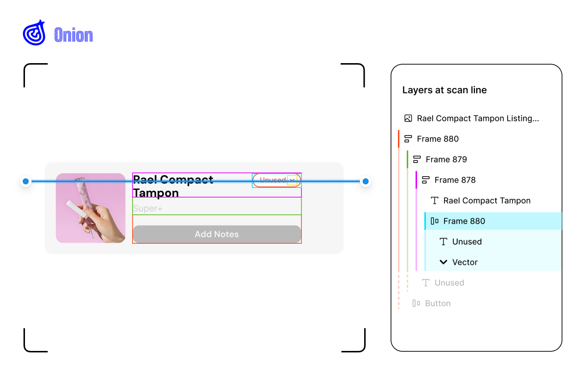 But as I built it out with a real mockup, it didn’t seem to fit to scan deeply nested frames by the y-axis. The scan line would technically intersect all parent frames, but rather than providing valuable context, that only adds visual noise.